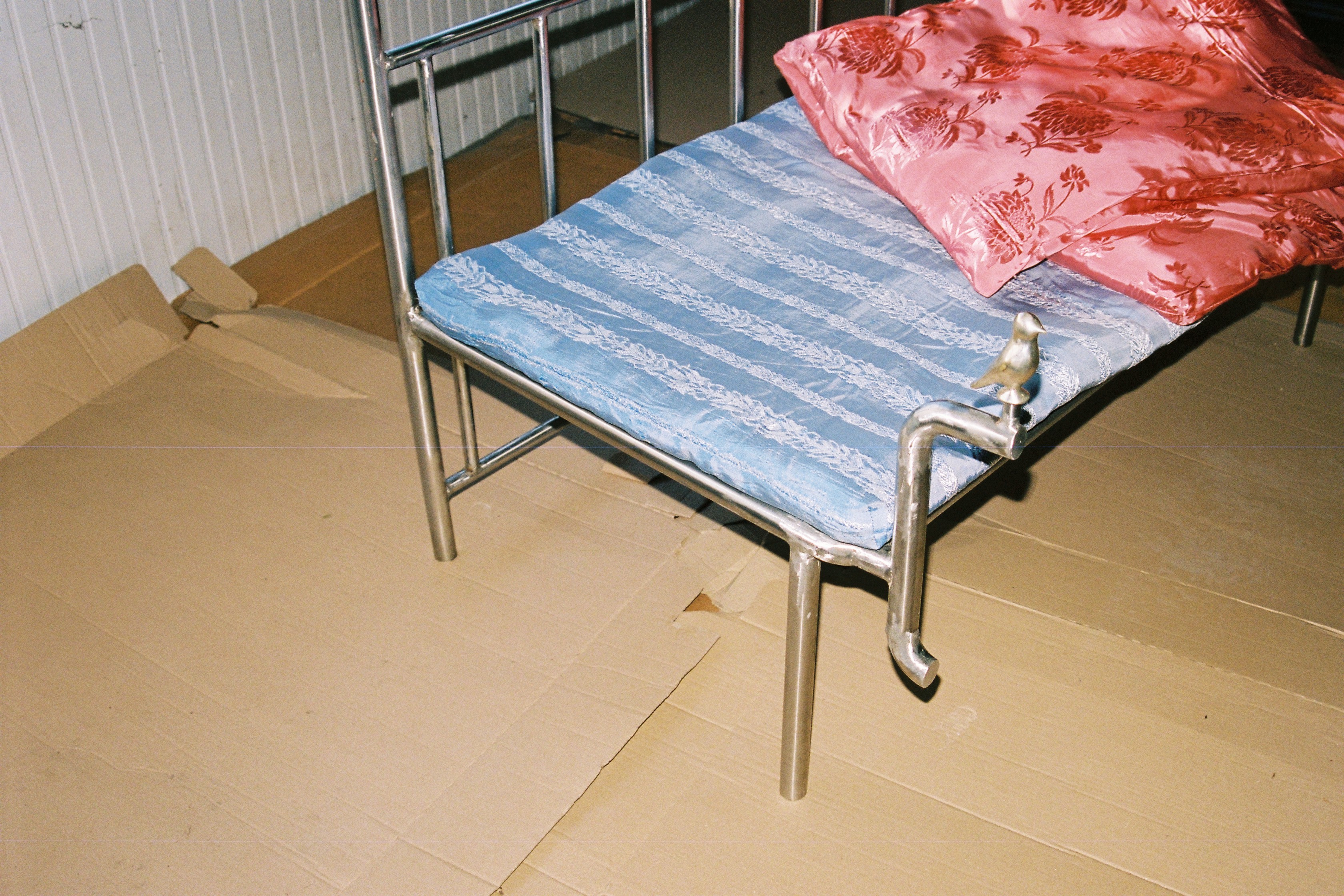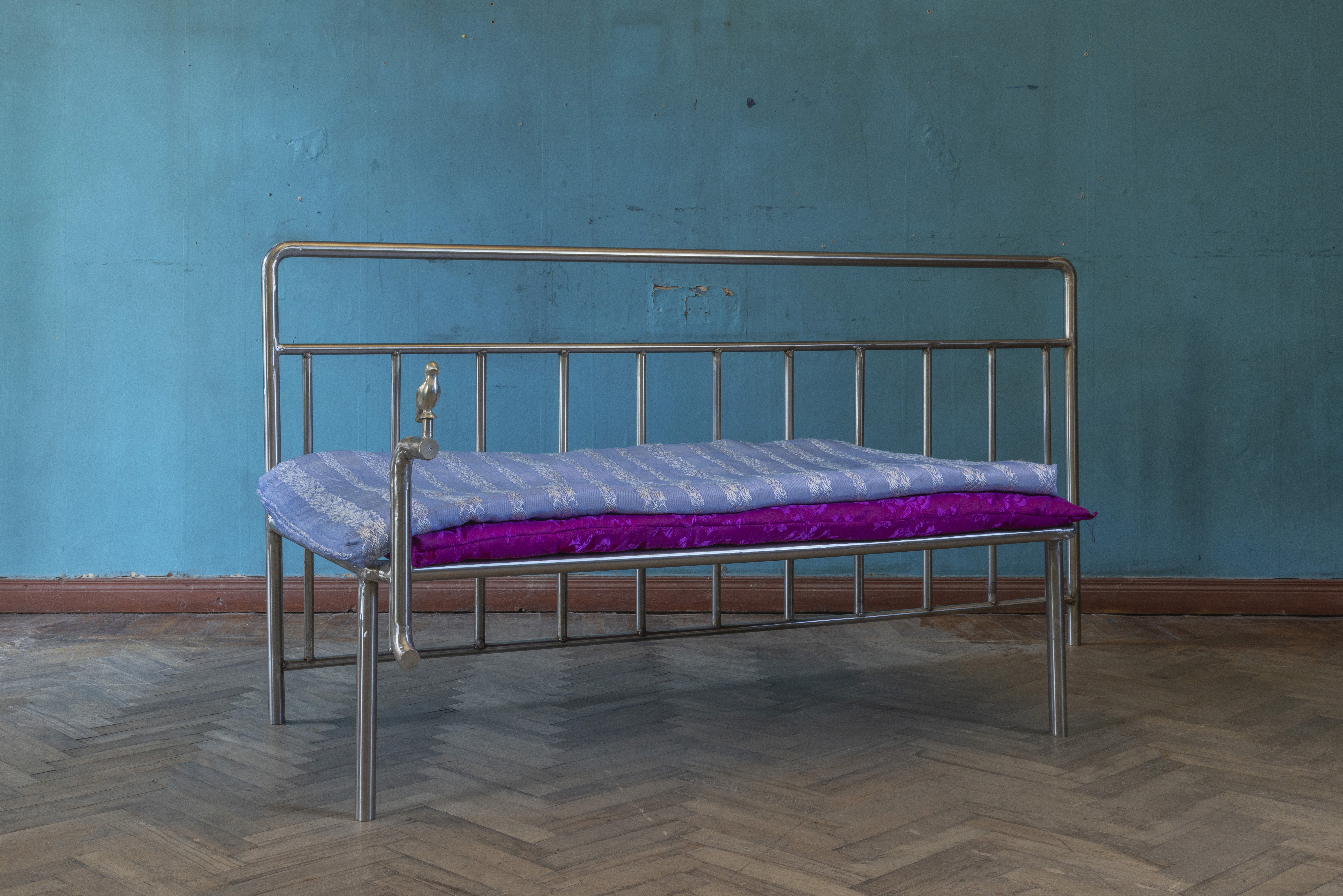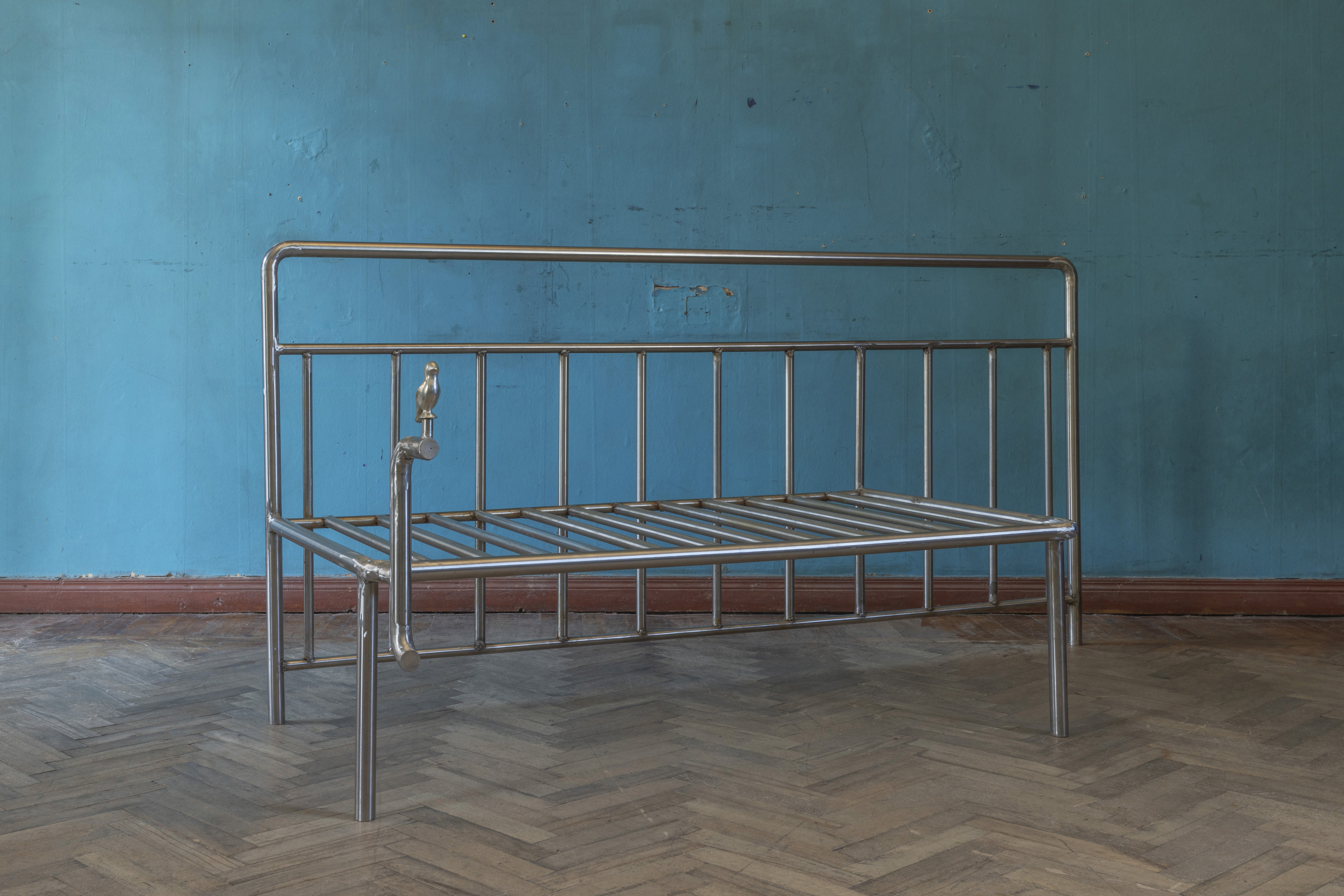 The Barricade Daybed transforms police barricade forms into sculptural stainless steel furniture. Its legs mimic barricade handles, while the frame reflects their rigid structure.