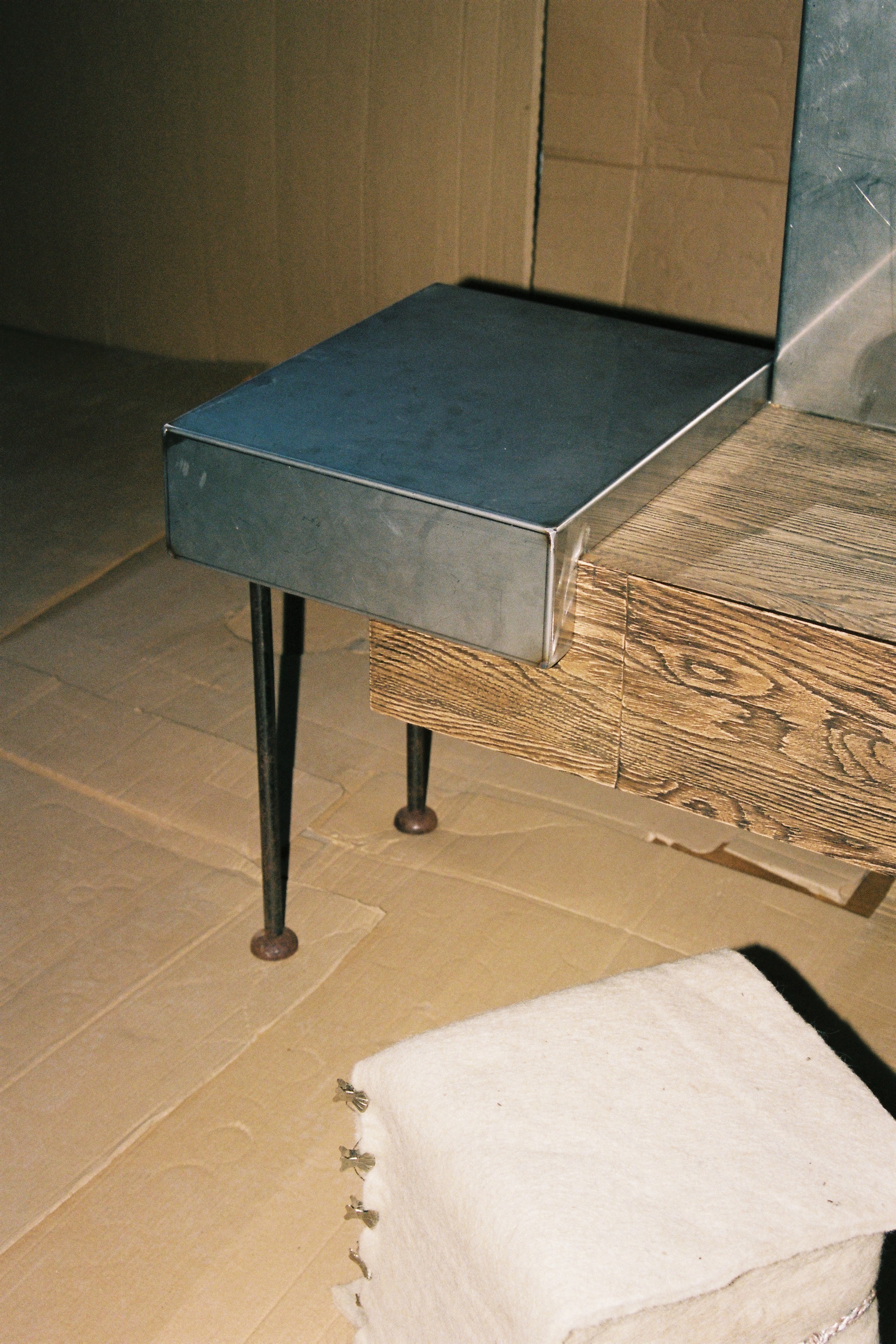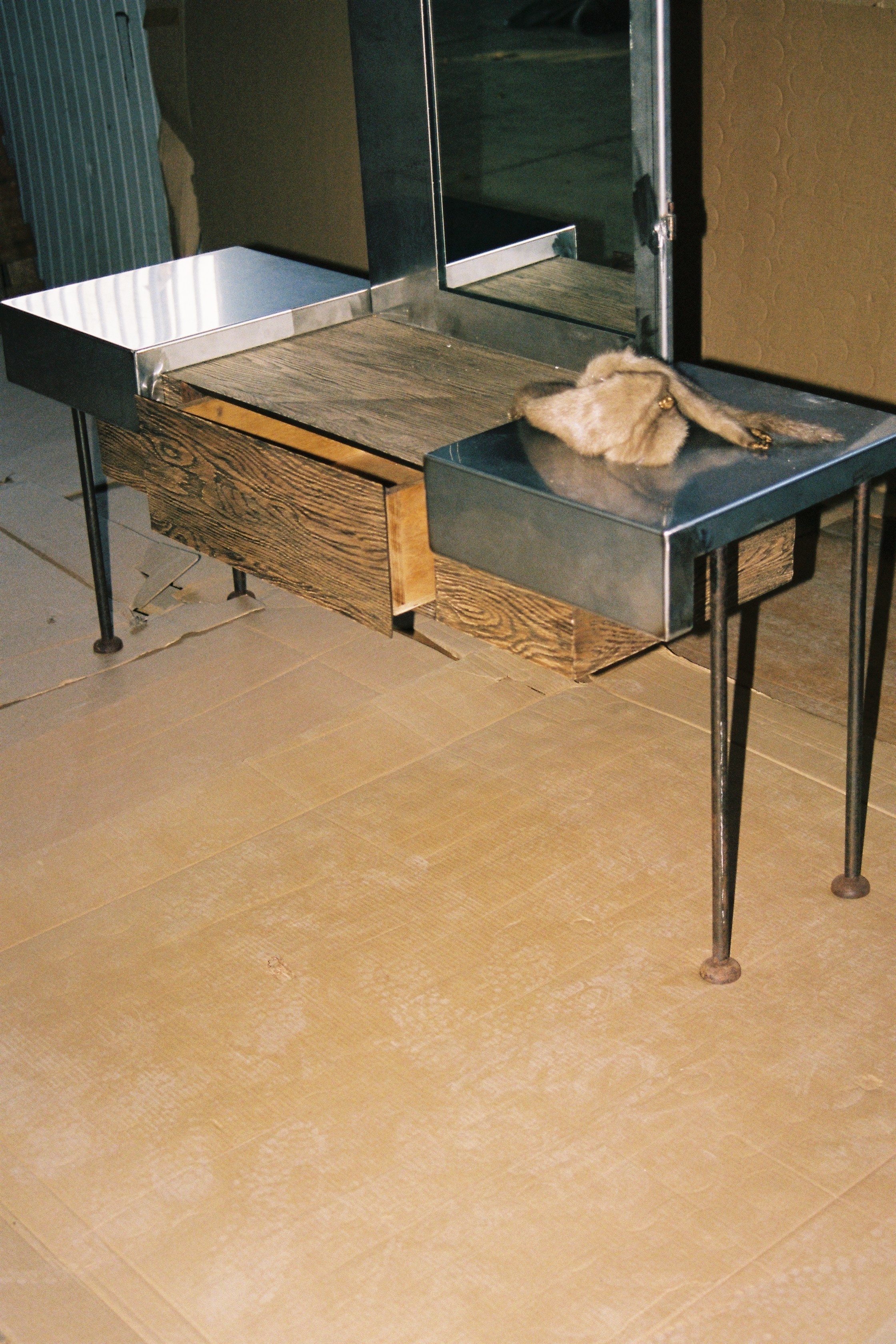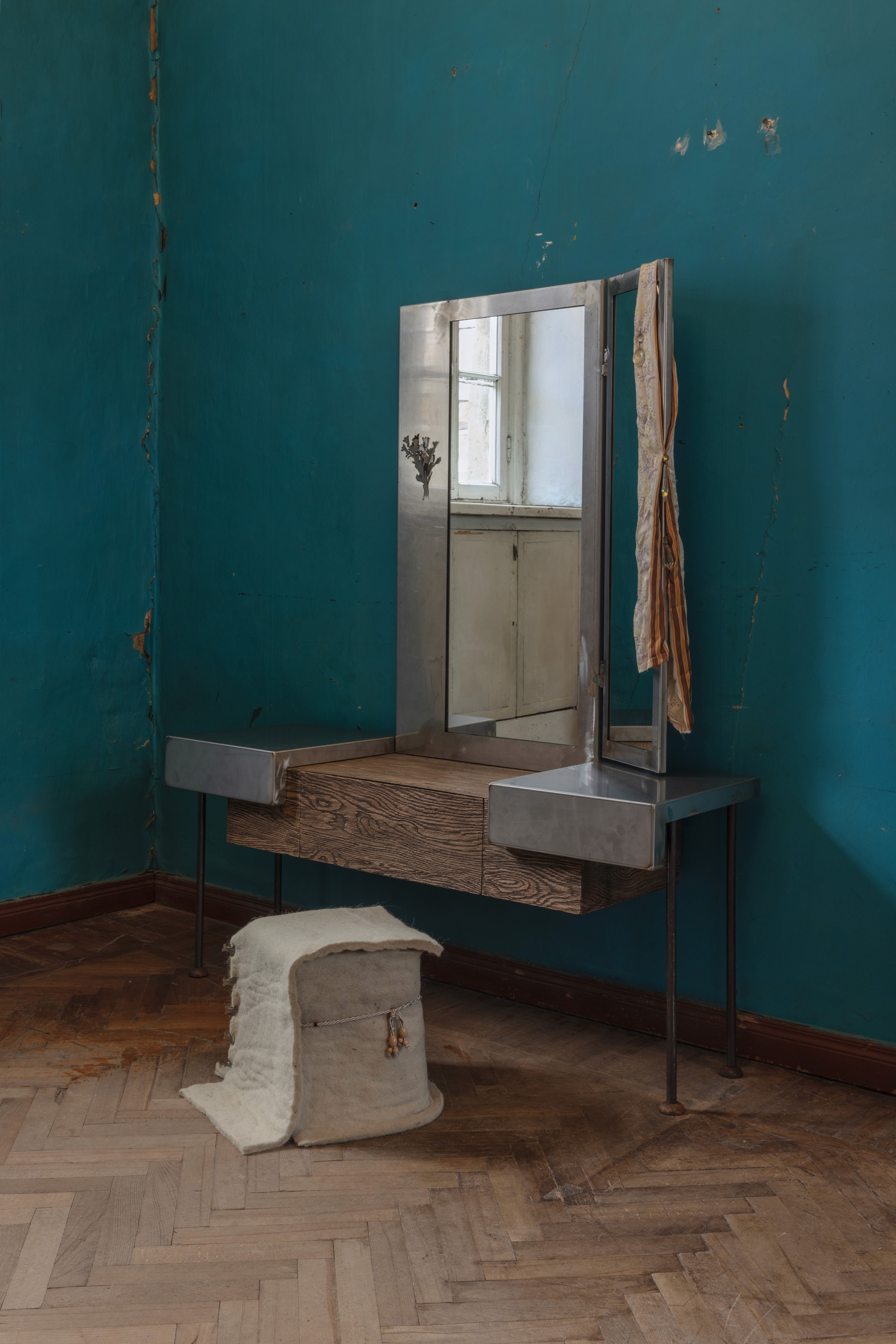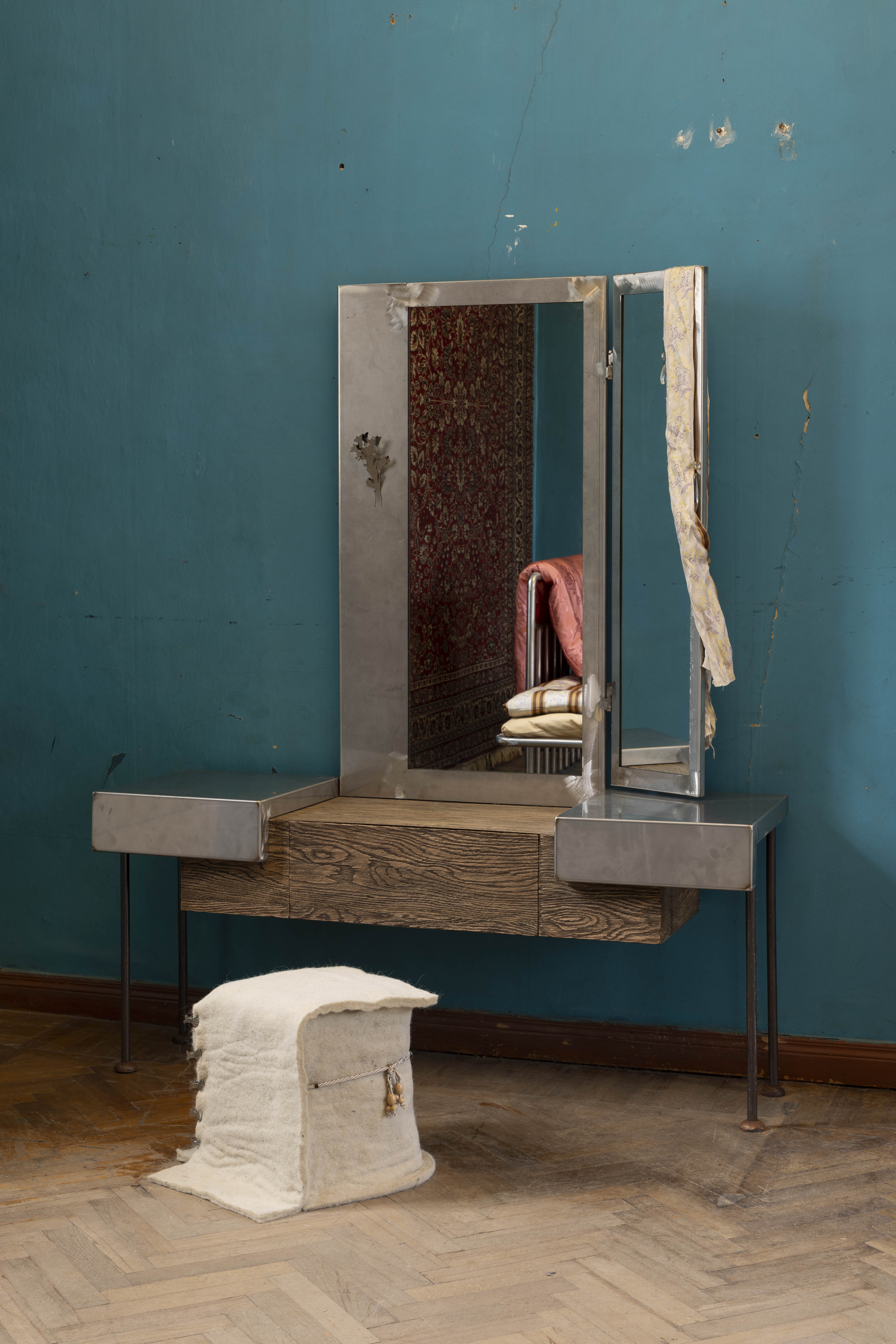 Part of this collection, Mom’s Dressing Table reflects the need for a sanctuary within the domestic space—a place where one confronts and reconnects with themselves.