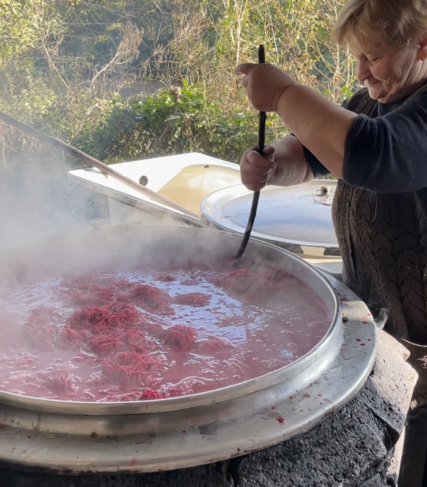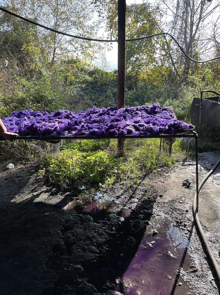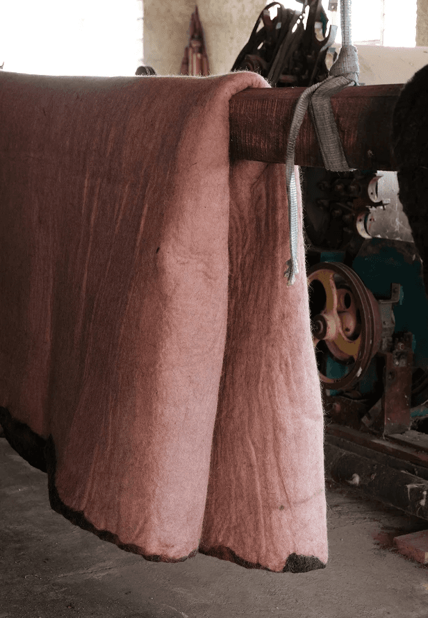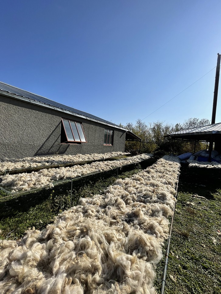 In 2021, when the studio was working on its first collection "Wool Diaries", the team began researching the history and techniques of felt-making in the Kakheti and Tusheti regions of Georgia. They spent time in these areas, working with local women to gain hands-on experience with traditional techniques, including making, coloring, and processing felt. Felt-making, a craft passed down through generations in Georgia's mountainous regions, remains a vital part of the local culture. It is still common to create traditional garments like the Nabadi coat and sacred hats, which are deeply rooted in the area's heritage. Felt- making continues to be a women's craft today, requiring significant physical labor. Most felt makers still rely on traditional methods, processing the material by hand without the use of modern technology.